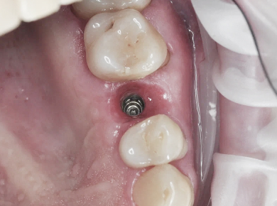 Результат: Эстетика и функция в зоне утраченного зуба полностью восстановлены. Десна сформирована анатомически корректно, коронка гармонично вписывается в зубной ряд.