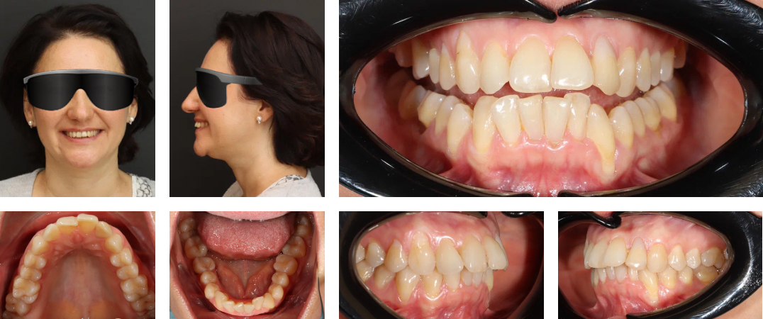Проблема: Пациентка обратилась с жалобами на неудовлетворительный результат после предыдущей ортодонтии, на оголение поверхностей корней зубов верхней и нижней челюсти, патологию прикуса, зубы сильно торчали вперед.