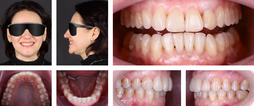 Результат: Удалось нормализовать окклюзию (смыкание верхних и нижних зубов), скорректировать наклон резцов, устранить избыточную протрузию и создать стабильное, функциональное смыкание. Зубные ряды приобрели симметрию и ширину, что позволило значительно улучшить эстетику и снизить риск дальнейшего оголения корней. Пациентка осталась довольна результатом и завершила активное лечение, перейдя на этап ретенции. В будущем планируется провести пластику десны в области передних зубов на нижней челюсти.