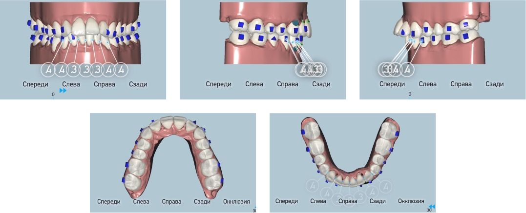 Ортодонтическое лечение проводилось на системе элайнеров с 4-мя винтами, было проведено расширение зубных рядов, сформирована арка улыбки, изменён наклон передней группы зубов.