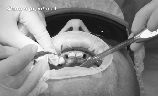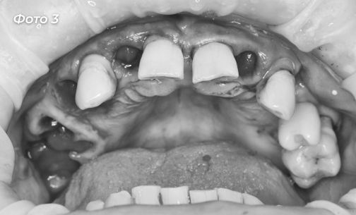 Пациенту были удалены некоторые зубы на верхней челюсти, остальные оставлены под опору для временного протеза (Фото 3, 4).