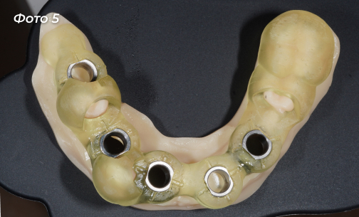 Был изготовлен хирургический шаблон для установки имплантов (Фото 5, 6).