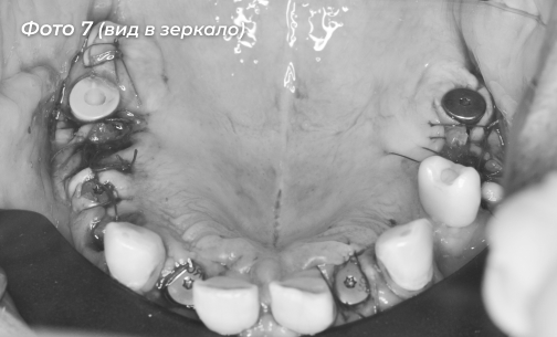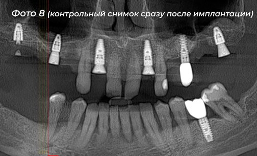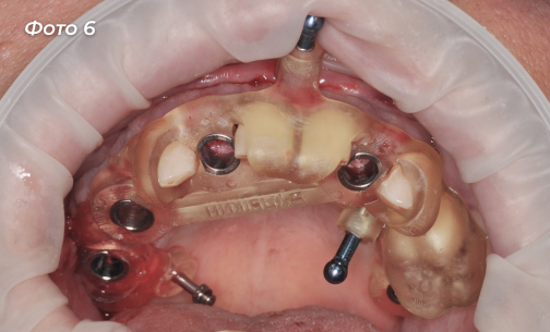 Было установлено 5 имплантов на верхней челюсти, 6-ой имплант был установлен ранее (Фото 7, 8). Сразу дать нагрузку на импланты не решились в связи с тем, что костная ткань у пациента была рыхлая.