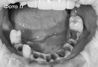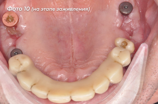 Был изготовлен и установлен временный протез с временной опорой на свои оставшиеся зубы (Фото 9, 10).