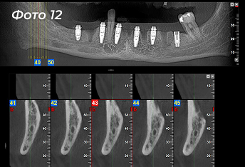 Через 4 месяца после первой операции было проведено оперативное вмешательство на нижней челюсти. Была выбрана другая тактика, были удалены сразу все зубы (Фото 11). Установлено 6 имплантов (Фото 12) по хирургическому шаблону (Фото 13).