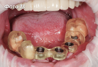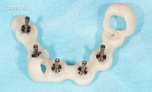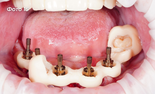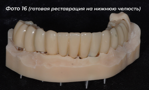 Изготовлена и установлена временная конструкция на нижнюю челюсть (Фото 14, 15).