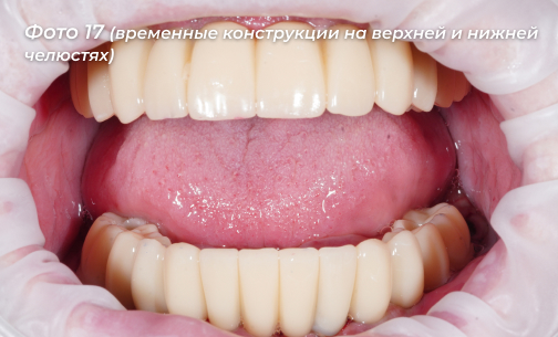 Готовый временный протез (Фото 16) установлен на нижнюю челюсть и фиксирован сразу на имплантах. Далее планируется заменить временные конструкции на верхней и нижней челюстях (Фото 17) на постоянные.