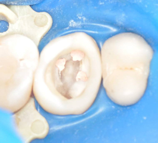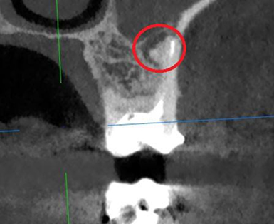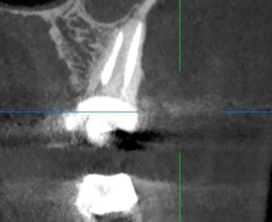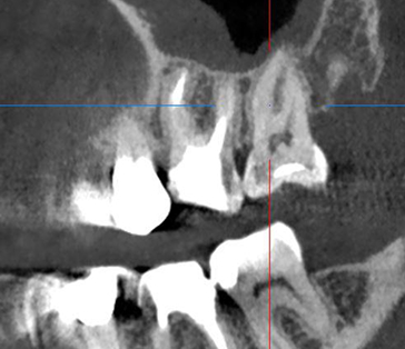 Лечение: Проведено эндодонтическое перелечивание зуба под микроскопом: удалены ранее внесённые материалы, выполнена тщательная механическая и медикаментозная обработка корневых каналов с учётом их анатомии. Особое внимание уделено устранению инфекционного очага (кисты), связанного с воспалением в области гайморовой пазухи. После этого каналы герметично запломбированы, а коронковая часть зуба временно восстановлена для дальнейшего покрытия зуба коронкой.